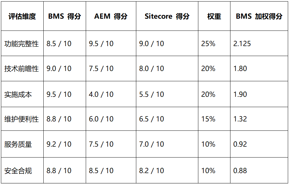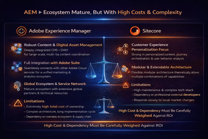 总体来看,AEM 与 Sitecore 在功能成熟度与国际市场验证方面具有明显优势,但其高成本、高复杂度与对外部生态的高度依赖,也使其并非所有企业的最优解。